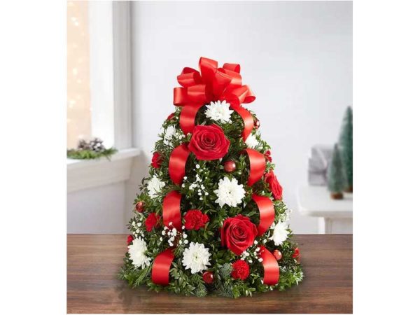 The holiday favorite that started it all! Our flower tree arrangement is popular for its festive style and compact size, which fits perfectly into any space. Gathered with fragrant evergreens, then trimmed with decorative ornaments and a merry red bow on top, this floral twist on a traditional tree makes a truly original gift for family, friends or your own home.