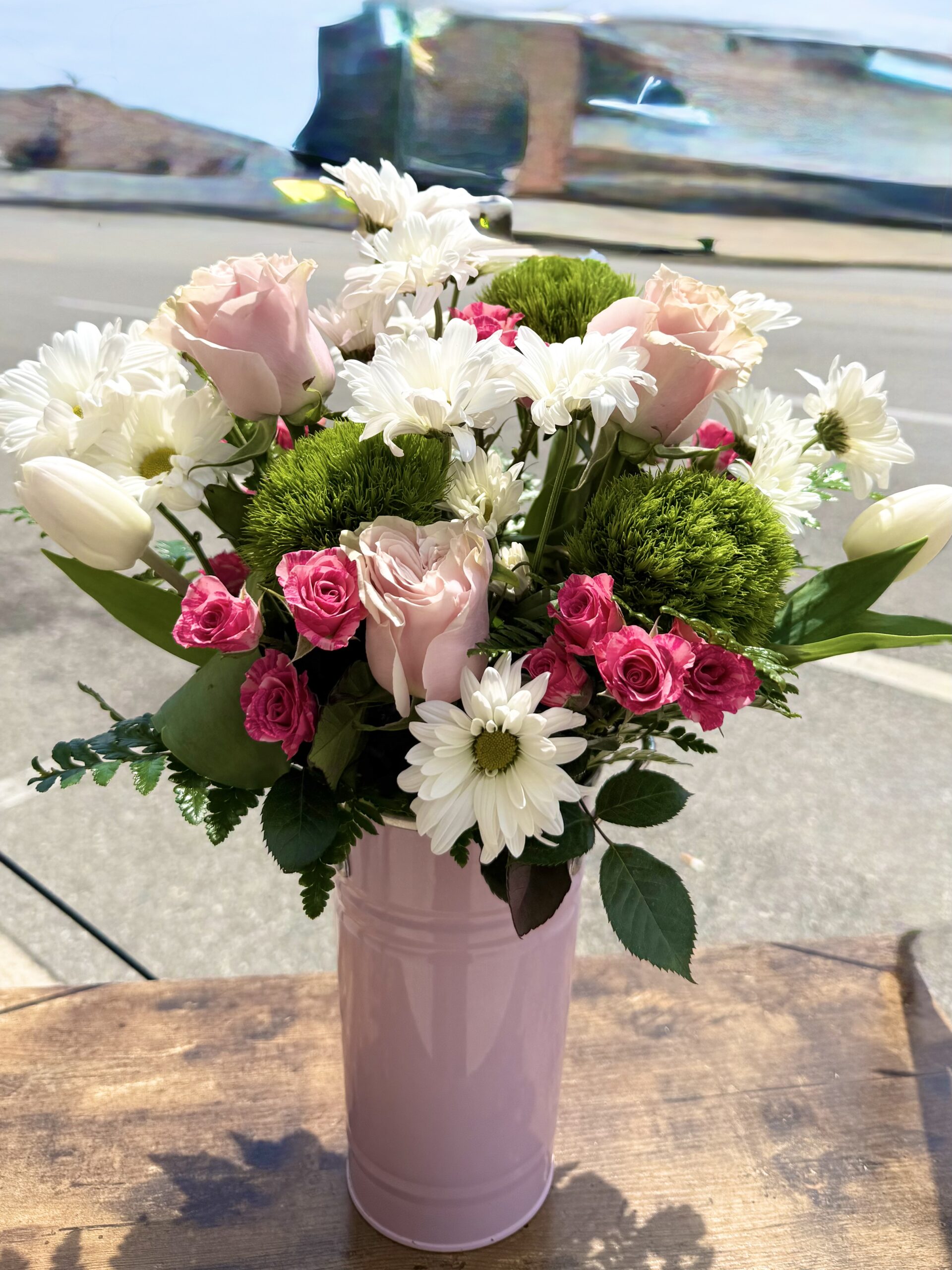 Shades of pinks and whites in this keepsake container. Featuring roses, spray roses daisy’s tulips and more!