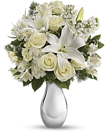 The stunning bouquet includes white roses, white spray roses, white oriental lilies, white alstroemeria and white stock accented with assorted greenery.