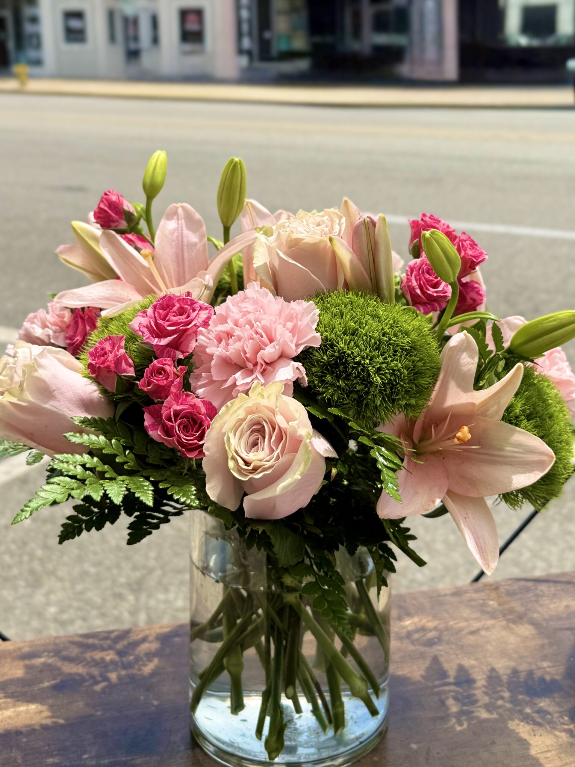 Pink roses, lilies, spray roses, carnations and greens designed in a glass cylinder.